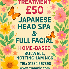 Deep scalp cleansing with special shampoo and warm water massage Gentle scalp exfoliation to remove impurities and improve circulation Nourishing scalp mask and treatment oils to stimulate hair growth and revitalise the scalp Relaxing neck and shoulder massage Aromatherapy steam for total relaxation โจ FULL FACIAL (approx. 1 hour) Deep facial cleansing tailored to your skin type Gentle exfoliation to remove dead skin cells and brighten your complexion Soothing steam to open pores and detoxify the skin Extraction (if needed) to clear blocked pores Hydrating mask rich in natural ingredients Facial massage to tone muscles and stimulate collagen Moisturising treatment to leave your skin glowing and refreshed ๐ผ BENEFITS ๐ผ โ Deep relaxation & stress relief โ Healthier scalp & hair โ Glowing, radiant skin โ Improved blood circulation โ Reduced tension in face, neck & shoulders Perfect for a summer refresh and self-care boost!
